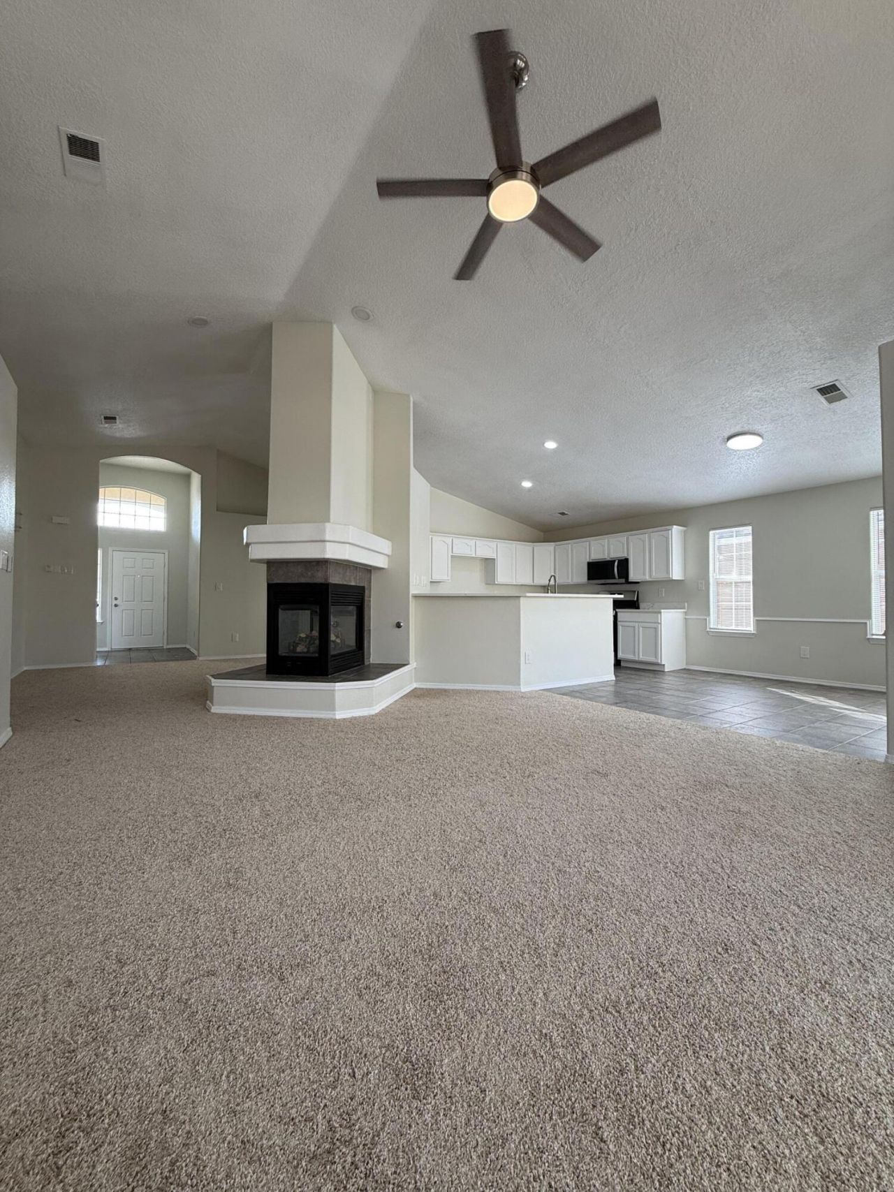 Single-story home featuring 3 bedrooms, 2 full bathrooms, and an office/ extra room. The home boasts new solid-surface countertops and high ceilings in the living area. Other recent upgrades include new two-tone paint, new carpet, and new stainless steel appliances.